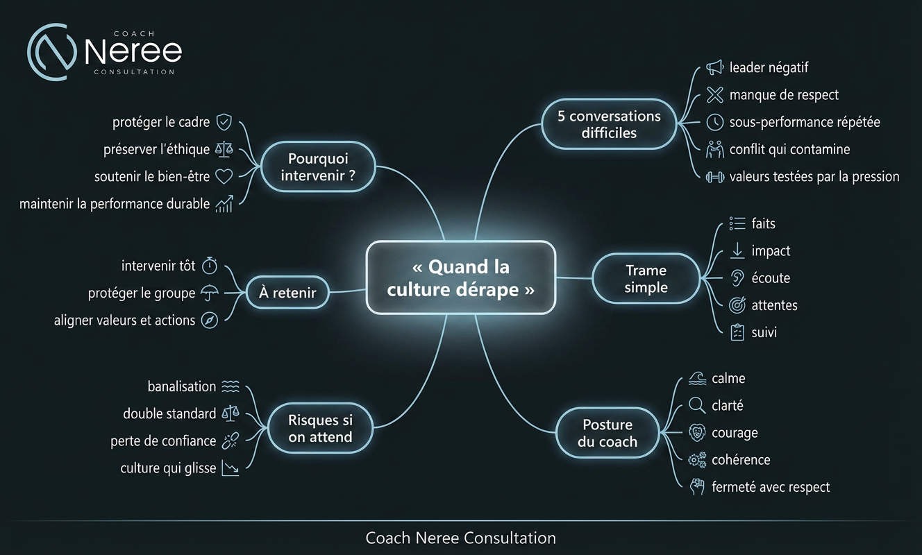 Autrement dit : quand la culture dérape, ton travail n’est pas d’éviter la tension. Ton travail est de la traverser correctement.